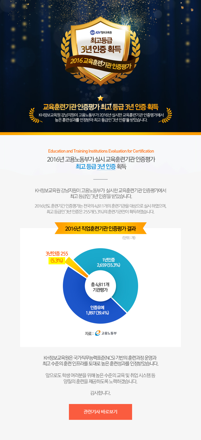 [축]KH정보교육원, 교육훈련기관 인증평가 '3년인증' 획득