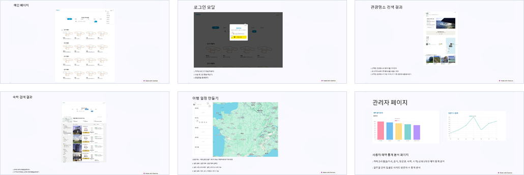 | 설계의 주안점 | 1. 사용자 중심의 정보 설계: 사용자가 원하는 정보를 쉽게 찾을 수 있도록 정보의 구조와 배치를 설계하고, 이를 통해 정보 접근성과 사용자 만족도 향상 및 직관적인 UI/UX를 통해 사용자에게 편의성 제공 2. 콘텐츠 품질과 신뢰성 확보: 정확하고 신뢰할 수 있는 여행 정보를 제공하기 위해 각종 정보에 관한 API를 사용함으로써 웹사이트의 유용성과 신뢰성을 향상에 기여 3. 상호작용성 및 커뮤니티 기능 강화: 사용자 간의 원활한 정보 공유와 소통을 위해 커뮤니티 기능을 제공하고, 이를 통해 사용자 참여 유도 |