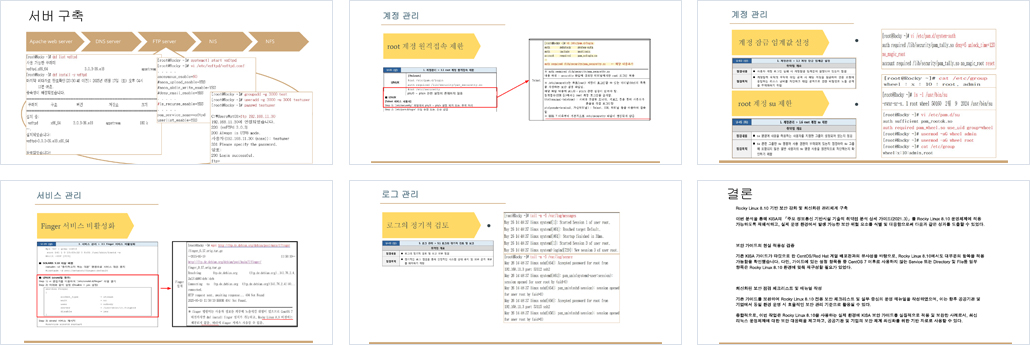 | 설계의 주안점 | 1. 침해사례를 반영한 실무형 보안 설정 - KISA에서 제시한 분석 및 평가 방법론을 기반으로 침해사례를 참고하여 보안 설정. - 각 보안 항목에 대해 “무엇을, 왜 해야 하는가”를 명확히 하여 이해도 및 현장 활용성 강화. 2. 서비스별 가상 환경 분리 및 통신 구현 - FTP, DNS, Apache, NFS, NIS 등 보안 취약점이 자주 발생하는 핵심 서비스를 별도 가상 머신에 구성하여 실습 환경을 구현. - NAT 환경(192.168.11.0/24) 내에서 A/B 클라이언트와의 양방향 통신을 통해 실제 운영 환경을 시뮬레이션. 3. 보안 원칙에 따른 계층별 접근 통제 - 계정 관리 → 파일 권한 → 서비스 제한 → 네트워크 방화벽 → 로그 및 추적 관리로 이어지는 계층별 보안 접근 방식 적용. 4. 표준화된 체크리스트 및 설정 가이드화 - 각 보안 항목별 점검 체크리스트와 설정 가이드 문서를 함께 제공하여 반복적 보안 점검 및 교육용 자료로 활용 가능. - 시스템 관리자 및 보안 담당자가 즉시 참고 가능한 문서화 형태로 구성 (스크립트 + 설명). 5. 보안 설정 미흡 시 발생 가능한 위협 시뮬레이션 - 보안 설정을 하지 않았을 때의 실제 침해 시나리오(예: 계정 탈취, 서비스 스니핑, 파일 손상 등)를 함께 제시. - 단순 설정이 아닌 설정하지 않을 경우의 리스크 인식을 유도하여 교육 및 실무 반영도 향상. |
