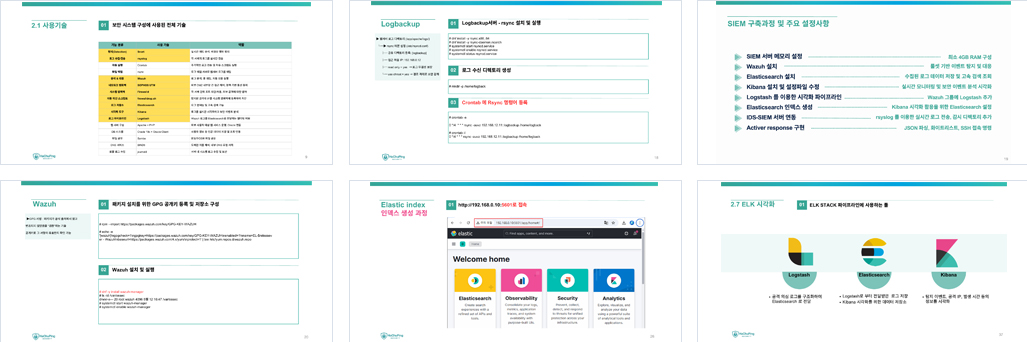 이** : 1. Wazuh 설치 및 실행 Wazuh 서버 설치를 위해 GpG서명 키 등록과 Wazuh Manager 레파지토리를 설정한다. Wazuh 설치, 및 디렉토리를 확인한다. systemctl start wazuh-manager로 Wazuh Manager를 실행한다. 2. Elastic 설치 및 설정 파일 수정 Elastic 설치한다. Elasticsearch 레파지토리를 설정하고 Elasticsearch를 설치한다. # vi /etc/elasticsearch/elasticsearch.yml 에서 설정 파일을 수정한다. 3. Kibana 설치 및 설정 파일 수정 kibana를 설치한다. 방화벽을 오픈한다. # firewall-cmd --permanent --add-port=5601/tcp # firewall-cmd --reload vi /etc/kibana/kibana.yml 에서 설정파일을 수정한다. 서비스를 시작한다. # systemctl enable kibana # systemctl start kibana 3. Logstash 설정 파일 생성 vi /etc/logstash/conf.d/wazuh-elasticsearch.conf에 Logstash 설정 파일 을 생성한다. vi /var/ossec/etc/ossec.conf에 Wazuh 로그 수집 경로를 등록한다. 4. DNS 서버 설치 및 설정 (BIND9) bind 패키지를 설치한다. ( yum install -y bind) /etc/named.conf를 설정한다. /var/named/zone 파일을 작성한다. 방화벽 및 SELinux를 disabled로 설정한다 DNS 질의 테스트 (nslookup)로 정상 동작을 확인한다. 5. IDS 서버(Snort) 설치 및 설정 Snort, daq를 설치한다. snort 실행에 필요한 기본 디렉토리와 rule 파일을 생성하고 퍼미션을 조정한다. /etc/snort/rules/local.rules에 rule을 추가한다. /etc/snort/snort.conf 설정한다. snort -i ens160 -A console -c /etc/snort/snort.conf로 테스트한다.