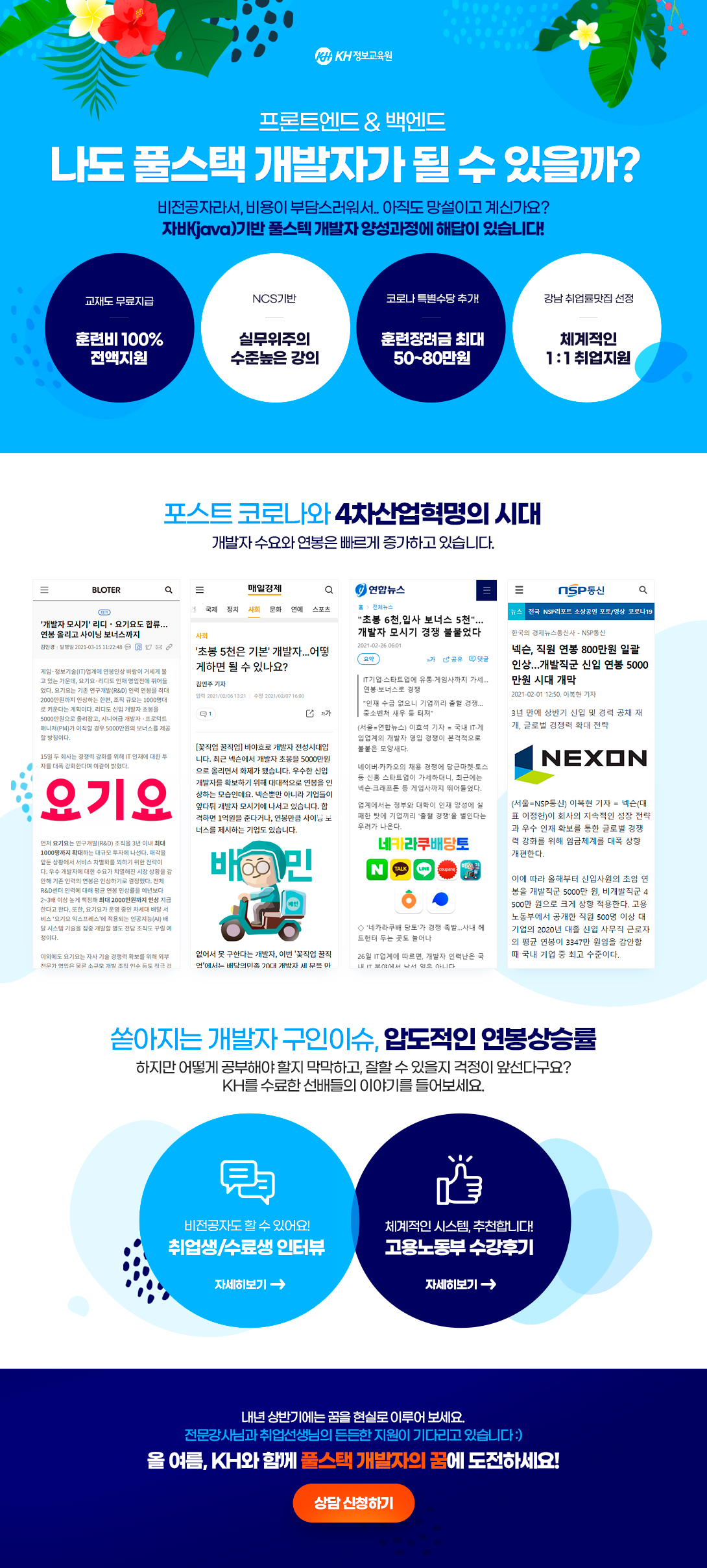 KH의 전 과정은 NCS(국가교육표준화)기준을 준수하며 최대 100% 무료 국비지원을 받으실 수 있습니다.
